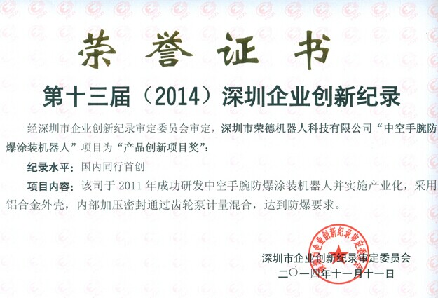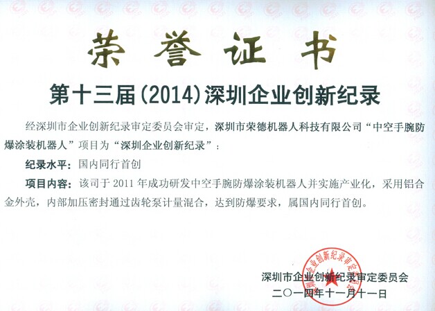 近日,由深圳市企業創新紀錄審定委員會為深圳市榮德機器人科技有限公司頒發了“第十三屆(2014)深圳企業創新紀錄”的榮譽證書,榮德公司自主研發制造的“中空手腕防爆涂裝機器人”榮獲“產品創新項目獎”以及“深圳企業創新紀錄”兩項大獎,紀錄水平為“國內同行首創”。