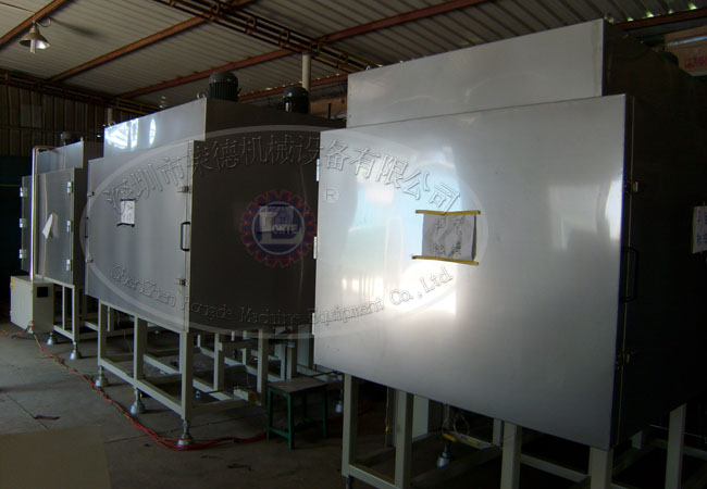 紫外光固化設備由光源、反射板、燈具、電源裝置、冷卻裝置、傳感器、工件輸送裝置、排氣換氣裝置、室體壁板及防紫外線照射擋簾等組成。中型工件的紫外光UV固化室一般為非標設備,根據(jù)產量、工藝要求、工件外形大小、輸送方式及速度等具體情況設計制造,小型工件的紫外光固化設備市場上有部分規(guī)格產品可供選購。